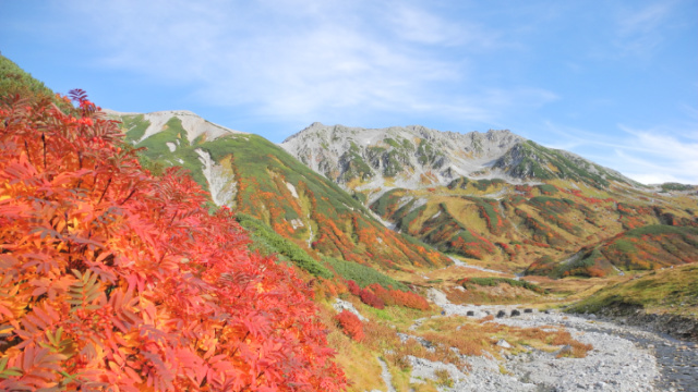 室堂平(2450m)では例年9月下旬頃に紅葉のピークを迎え、その後紅葉前線は徐々に標高を下げていきます。山一面が鮮やかに色づく高山帯の紅葉は圧巻の景色です。
