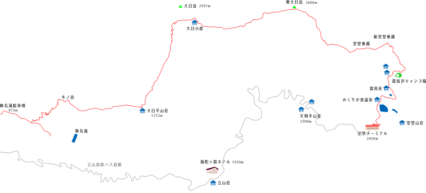 室堂ターミナル → 雷鳥沢キャンプ場 → 新室堂乗越 → 室堂乗越 → 奥大日岳 → 大日小屋 → 大日平 → 牛ノ首 → 称名滝駐車場
