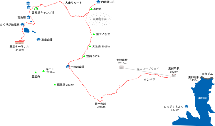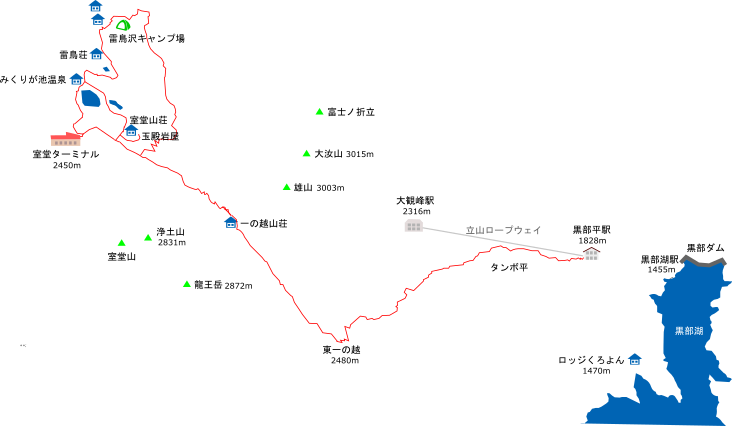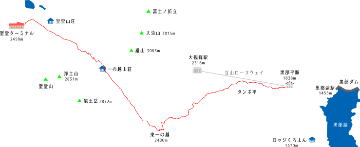 室堂ターミナル → 室堂山 → 浄土山 → 一の越 → 東一の越 → タンボ平 → 黒部平 → 黒部湖 → 黒部ダム
